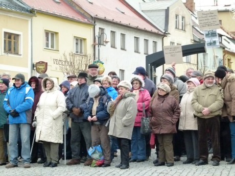 Slavnostní ukončení stavby Regenerace náměstí J. z Poděbrad 4.12.2013, protestující s transparenty upozorňují na znehodnocení památkových hodnot náměstí (foto B. Prchal).